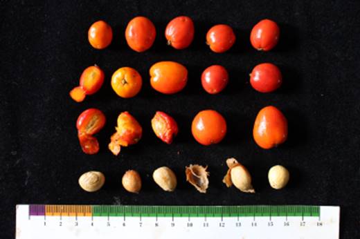 Mudas: As sementes são oblongas (mais longas que largas), recalcitrantes (perdem o poder germinativo se forem secadas) e germinam em 40 a 70 dias se plantadas em substrato de 50% de terra vermelha, 30% de matéria orgânica e 20% de areia. Recomendo plantar 2 sementes diretamente em saquinhos individuais e quando as plântulas estiverem com 10 cm, eliminar a planta mais fraca e mal localizada. As mudas devem ser formadas sob sombreamento de 50% e atingem 30 cm com 10 a 12 meses de vida.
