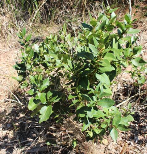 Características: É um arbusto com 1 a 3 metros de altura com 3 a 5 ramos elípticos partindo da base, o caule velho é de cor esbranquiçado com casca que tem pequenas fendas ou rugas. As folhas são simples, opostas, cruzadas, de consistência coriácea (semelhante a couro), subsésseis (com pecíolo ou haste muito curta). A lamina mede 4 a 9 cm de comprimento por 2 a 3,5 cm de largura; é oblanceolada (forma de lança invertida com a ponta voltada para base), com base atenuada (que se estreita-se) e ápice apiculado e obtuso (com ponta curta e arredondada). As flores são hermafroditas, reunidas em fascículos (pequenos feixes ou grupos) em numero de 5 a 15 flores esbranquiçadas com pedúnculo (haste ou suporte) de 1 a 2,2 cm de comprimento. As flores medem 1 cm na antese, tem cálice amarelado e corola com pétalas e estames brancos. Os frutos são drupas de até 0,6 a 1,2 cm de diâmetro de cor vermelha ou negra quando bem madura, com uma semente reniforme (com forma de rim) de 4 a 7 mm.