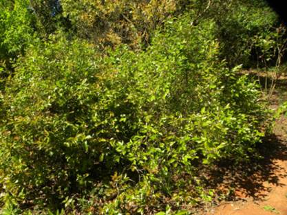 Características: Arbusto lenhoso de 50 a 80 cm de altura, formando touceiras de até 1 metro de diâmetro, com raiz do tipo xilopódio (órgão subterrâneo semelhante a batata), multiplica-se vegetativamente por raízes horizontais que se afloram na superfície. As folhas simples, opostas de textura cartácea (de cartolina), sob pecíolo ou haste de 4 mm de comprimento de margem lisa e base cuneada (com forma de cunha) e ápice ou ponta arredondada ou lanceolada (em forma de laça), medem 5 a 7 cm de comprimento por 2 a 3,5 cm de largura. As flores medem de 1,5 a 2 cm de diâmetro são brancas, hermafroditas solitárias ou fasciculadas (reunidas em feixes de 2 a 5), tem 5 pétalas livres, estão sob pedúnculo ou haste de 3 a 4 cm de comprimento; e produzem frutos achatados nos pólos de 1 a 3 cm de diâmetro contendo de 1 a 7 sementes e tendo formas variadas conforme mostram as fotos acima.