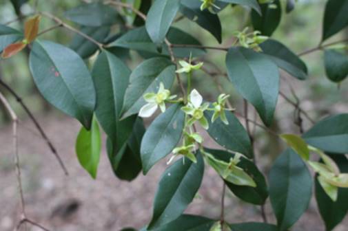 Características: arvore de pequeno porte atingindo 3 a 5 m de altura floresta semidecidual; já na floresta ombrófila chega a atingir 12 m de altura. O tronco é cilíndrico as vezes tortuoso com casca fina que se desprende em laminas desuniformes. A copa é piramidal, perenifólia, com folhagem esparsa. As folhas são subcoriáceas (rijas), de cor verde escura na face superior e meio amarelada na face dorsal; são glabra (sem pelos), oval-oblongas (forma de ovo alongado) medindo 4 a 7 cm de comprimento por 1,5 a 3,5 cm de largura, com base longo cuneada (forma de cunha) e ápice longo acuminado (com ponta longa). As flores nascem em pequenos racemos (tipo de caco curto) axilares de 3 a 6 cm de comprimento com 2 a 8 flores com 4 sépalas esverdeadas lanceoladas e 4 pétalas brancas de 1,2 a 1,6 cm de comprimento. Os frutos são bagas de globosas com 4 costas, medindo de 1,7 a 2,6 cm de diâmetro.