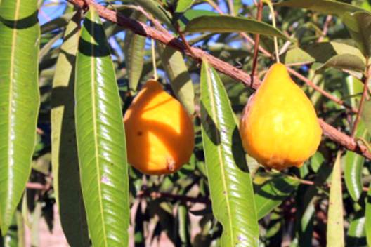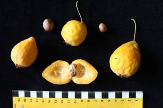 é piriforme, alaranjado quando maduro, medindo 2,5 a 5,8 centímetros de