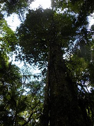 diâmetro e a copa é arredondada e formada no dossel da floresta. As folhas são