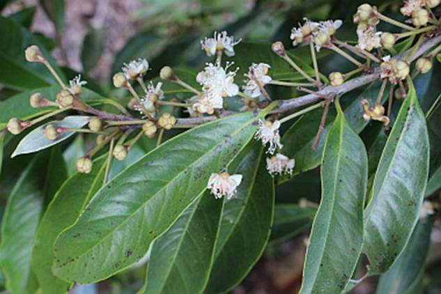 Características: Árvore de 4 a 6 metros (ou até 16 m quando na mata) com copa piramidal, compacta e de folhagem perene, o troco é bifurcado tortuoso e cilíndrico, com casca fissurada que se solta em planas espessas no sentido longitudinal; tendo coloração acinzentada. As brotações e ramos novos tem tricomas (pelos em forma de T) acastanhados de 3 mm. As folhas são inteiras, obovadas (com forma de ovo invertido, com a parte mais larga voltada para o ápice) e lanceoladas, opostas e glabras (sem pelos). Tem textura cartácea (como cartolina), medindo 8 a 12 cm de comprimento por 2,7 a 4 cm de largura com 10 a 18 nervuras laterais de cada lado. O pecíolo mede 8 a 10 mm de comprimento, a base da lamina é cuneada (com forma de cunha) e o ápice é acuminado (com ponta longa). As flores são nascem nos ramos maduros em racemos (tipo da cacho) de 1 a 2 cm, com 2 a 6 flores. As flores são cíclicas (distribuídos em vários ciclos), diclamídeas (com dois envoltórios) e medem 1 cm de diâmetro; tendo cálice (invólucro externo da flor) cupulado (com forma de cúpula) com 4 sépalas livres de 7 mm de comprimento e corola (invólucro esterno) com 4 a 5 pétalas brancas. Os frutos são oblongos (mais longo que largo) e medem 1,5 a 2,2 cm quando maduros e tem coloração VERMELHA OU ROXA ESCURA, contendo 1 semente arredondada de 5 a 8 mm no centro.