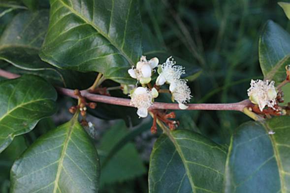 Características: Arvore de 3 a 5 metros quando cultivada, podendo chegar a 20 m de altura na mata em estado nativo. A copa é globosa ou na forma de taça (arvores maduras) com galhos e ramos na forma de V, bifurcados, com tronco cilíndrico e casca fina mais áspera de cor castanho claro e acinzentado, medindo de 10 a 35 cm de diâmetro. As folhas são inteiras, brilhantes, opostas e glabras (sem pelos) com cerca de 5 a 15 cm de comprimento por 4 a 9 cm de largura. Essa espécie pode ser facilmente identificada por se observar as nervuras segundarias que são bem largas e amareladas na face superior da folha. As flores surgem em fascículos (buques) nas axilas das folhas com 3 a 15 flores cíclicas (distribuídos em vários ciclos), diclamídeas (com dois envoltórios) e medem 2,5 cm de diâmetro e tem cor das pétalas brancas. Os frutos são arredondados ou achatados nos polos cobertos de pelinhos velutinos quando verdes, tronando-se glabros (sem pelos) ao amadurecer, estes medem 1,5 a 3 cm de comprimento por 2 a 2,6 cm de diâmetro e no ápice são coroados pelas sépalas dobradas persistentes. As sementes são de cor creme esbranquiçadas e irregulares, medindo 8 a 15 mm de diâmetro.