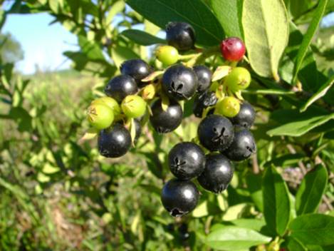 fruto é uma baga vermelho nigrescente de 5 a 8 mm de diâmetro, com até 15 sementes