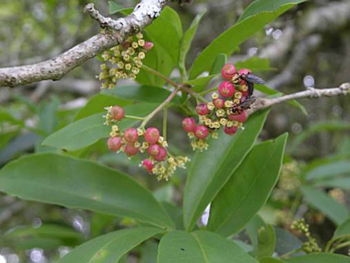Características: arvore perenifólia de 3 a 6 metros quando cultivada ou até 10 m quando na mata, com copa arredondada e troco sinuoso e bifurcado (com 2 ou mais troncos), com forma cilíndrica atingindo 20 a 40 cm de diâmetro; com casca fina de cor acinzentada e quase lisa ao tato. Essa espécie pode ser facilmente identificada por se observar as brotações e pecíolos (haste ou suporte) de cor rosada. As folhas são inteiras, simples, opostas, brilhantes e glabras (sem pelos) medindo 6 a 10 cm de comprimento por 2,5 a 5 cm de largura. A lamina textura membranácea (delicada) e carnosa, com base cuneada (com forma de cunha) e o ápice apiculado com ponta curta, sob pecíolo de 07 mm a 1,5 cm de comprimento. As inflorescências são do tipo panicula (Cacho piramidal) corimbosas (arredondadas) com pedúnculos (haste ou suporte) carnoso de cor avermelhada, suportando e 16 a 72 flores biparas ou trimeras (em grupo de 2 ou 3) muito pequenas e de cor esverdeada. O Fruto é uma drupa (com 1 semente ou pirênio) de cor negra, com forma oval ou arredondada oblonga medindo 1 a 1,5 cm de comprimento por 7 a 13 mm de largura envolvendo uma semente cilíndrica.