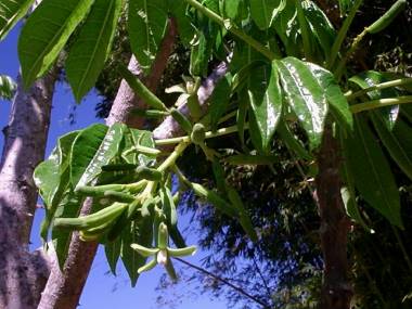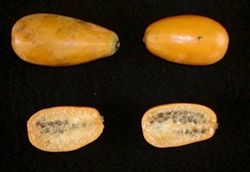 polpa amarelo alaranjada, lembram o sabor do maracujá e da manga, contem látex