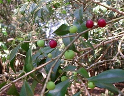 Características: Arvore pequena de sub-bosque que atinge 3 a 4 metros de altura, com ramos e galhos esparsos formando copa rala, o tronco é reto e liso com 8 a 20 cm de diâmetro, de casca descamante no sentido longitudinal, com cor avermelhada e opaca. A ponta dos ramos novos é avermelhada após a brotação. As folhas são simples, opostas e glabras (sem pelos) com pecíolo ou haste de 3 a 4 mm de comprimento. O limbo ou tecido foliar é de textura cartácea (como cartolina) e mede 3 a 4 cm de comprimento por 0,8 a 1,8 cm de largura, tem forma obovóide (forma de ovo, com a parte larga voltada para baixo) e ápice ou ponta acuminado (ponta longa e comprida). As flores são hermafroditas e nascem em grupos de 3 a 5 nos glomérulos (tipo de cimeira ou cacho multíparo com flores condensadas) axilares (na base ou encontro da folha com o ramo). As flores individuais são minúsculas, diclamídeas (com dois envoltórios), com bractéolas (folha modificada e reduzida) conatas (concrescidas) no terço inferior do botão floral; constituídas de: cálice (invólucro externo) com 5 sépalas unidas e corola (invólucro interno) com 5 pétalas brancas, livres de 3 mm de comprimento e glabras (sem pelos). Os frutos são bagas ovóides vermelhas, alaranjadas ou amarelas de 0,6 a 1,2 cm de diâmetro, com casca bastante fina de cor vermelha ou púrpura, com arilo alaranjado envolvendo de uma a três sementes reniformes (com forma de rim), muito pequenas e esverdeadas.
