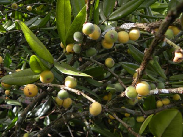 Características: Arvoreta ramificada de 2 a 4 m de altura, com caule dividido em vários galhos desde a base, do qual surgem ramos que são declinados e bifurcados. O tronco atinge pequenas dimensões, medindo de 5 cm a no máximo 10 cm de diâmetro e é coberto por uma casca fissurada (com rugas) no sentido longitudinal, com coloração marrom enegrecida. As folhas são simples, opostas, inseridas num mesmo plano sob pecíolo (haste ou suporte) curto, denso e bruneo-viloso (coberto de pelos longos e escuros), medindo de 3 a 5 mm de comprimento. A lamina foliar é elíptica (alongada), cartácea (com textura de cartolina), com base obtusa (arredondada) ou truncada (reta, cortada) e ápice longamente agudo ou pontudo, medindo de 6 a 12 cm de comprimento por 2 a 3,6 cm de largura. As flores surgem nas axilas das folhas ou nos ramos desnudados (sem folhas) sob a copa, são sésseis (desprovidas de cabinho) e pauciglomeradas (aglomeradas no caule) em numero de 3 a 15 flores. Contém cálice (invólucro externo) é formado por alabastros (um vaso de elevação) de 4 a 6 mm de altura e 4 lobos esverdeados triangulares de 2 a 3 mm de comprimento, dispostos em cruz e que fazem a vez das sépalas. A corola (invólucro interno) é formado por 5 pétalas cremes, arredondadas, côncavas de 4 a 5 mm de comprimento, as quais caem 2 dias depois a antese da flor. O fruto é uma baga globosa de 1,4 a 1,7 cm de altura por 2 a 2,3 cm de largura, que é levemente achatada nos pólos, albo pubescente (com pelos esbranquiçados) quando verde e tomentosas (coberta de lanugem) quando madura. Nessa época, a casca (tem espessura de 1,3 mm) adquire coloração amarela intensa, e recobre uma polpa translúcida e sucosa de agradável sabor, as quais envolvem 1 ou 2 ou raramente 3 sementes de coloração creme.