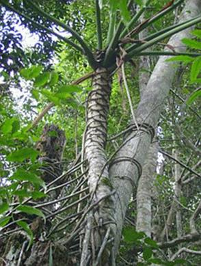 PLANTA QUE PRODUZ FRUTAS BRANCAS COMO EPIFITA NA ARVORE E DETALHE DO CAULE |
