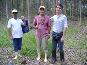 Foto que mostra da esquerda para direita o Ilson (meu assistente), o mateiro Joaquim no meio, e eu (Helton Josué) ao lado direito.