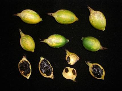 de sementes planas envoltas por arilo de cor escura.