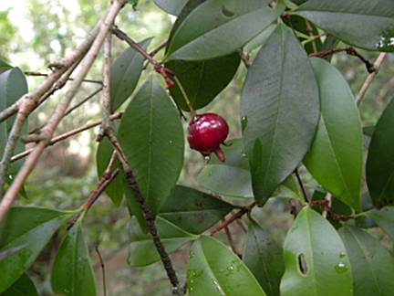 Um outro ribeirão visitado encontramos mais uma rara e mangifica fruteira da familia das Myrtaceas. A arvore é bem semelhante a Uvaia, tanto no tronco como na folhagem, o fruto é diferente, lembra a nossa apreciadíssima Grumixama (Eugenia brasiliensis) porém o fruto é menor, mais o sabor é muito melhor, o nome popular dessa espécie é Grumixama mirim. A planta é bastante rara e só ocorre em solos úmidos e ricos em matéria orgânica. Visto ser planta de um grupo bastante grande e complexo, demoramos uns 5 meses para identificar corretamente como sendo a Eugenia blastantha. É fácil de cultivar e inicia a frutificação precocemente com 3 anos. A planta é uma arvoreta compacta e pode ser cultivada como cerca viva, tendo um belo efeito ornamental devido a brotação ferruginosa das folhas. Veja foto do Fruto: