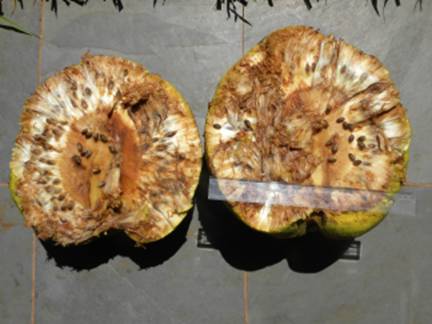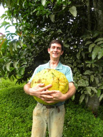 OBSERVAÇÕES: DEPOIS DE 9 ANOS DE ESPERA, TIVEMOS A ALEGRIA DE VER ESSA RARIDADE FRUTIFICAR NO SITIO FRUTAS RARAS PELA PRIMEIRA VEZ EM ABRIL DE 2.010, PORÉM ATÉ 2.013 O FRUTO NÃO PRODUZIU AS VALIOSAS SEMENTES COMESTIVEIS. MAIS EM FEVEREIRO DE 2.014 FOMOS SUPREENDIDOS COM A GIGANTESCA FRUTA DE 24 KG QUE ESTOU CARREGANDO ABAIXO. ESSA FRUTA PRODUZIU 1,600 KG DE SEMENTES.