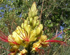 Arbusto inerme de 1 a 3 m de altura y follaje caduco. Hojas impari-bipinnadas con 6 a 14 pares de pinnas, multifolioladas, glabras. Flores hermafroditas, con 5 pétalos abiertos, imbricados, color amarillo y con grandes estilos y 10 estambres de color rojo vivo, dispuestas en racimos multifloros simples, terminales, con pedúnculos y pedicelos glandulosos. Fruto, legumbre estipitada de 5 - 10 cm de longitud, bivalva, polisperma, comprimida, dehiscente.