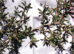 Arbusto de follaje persistente, muy ramificado, que alcanza, a lo sumo, 3 metros de altura y tronco de corteza oscura con ramas ascendentes que a su vez llevan otras más pequeñas horizontales, alternas, leñosas, cortas y todas de ápice muy agudo, espinescentes.