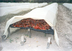 Así pensado, un tendalero o bandejas, que se encuentren a unos 80/90 cm del suelo donde el pimiento para pimentón esté protegido de toda contaminación, cumplirá adecuadamente con lo que queremos lograr: secado rápido, higiénico, cómodo para trabajar y de bajo costo. Habrá que cuidar que esté aireado - con aire limpio y capas de espesor adecuado - y remover frecuentemente para asegurar que el secado sea parejo.