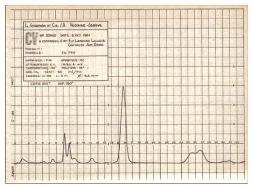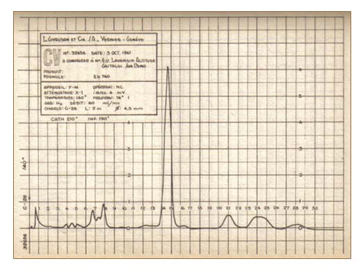 Los cromatogramas muestras que la esencia de lavanda prácticamente carece de alcanfor (volumen de retención 23 mn), pero contierne notablemente terpineno - 1 o 1-1 (26,6 mn) y borneol (30,5 mn). La esencia de lavandín contiene alcanfor (21 mn), menos terpineno - 1 o 1-4 (24,7 mn) que la de lavanda y aproximadamente igual cantidad de borneol (27,8 mn).