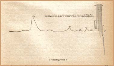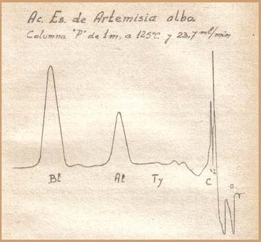 Por ejemplo, en el caso de un aceite esencial obtenido de cultivo experimental en el país, el de Artemisia alba, sobre el cual no había antecedentes de composición, el cromatograma obtenido en fase gas-líquido (se uso equipo Perkin Elmer, modelo 154C, donado a la Facultad de Ciencias Exactas y Naturales por el Consejo Nacional de Investigaciones Científicas y Técnicas), usando columna de polisuccinato de dietileno glicol al 10 % sobre chromosorb, de un metro por 1/4" a 125° C y con flujo de 23,7 ml/minuto de N2, presión 4 psi, permitió identificar claramente los tres componentes principales: cineol, alcanfor y borneol (por ubicación de los picos, olor de los eluatos y reacciones de identificación después). (Véase el cromatograma adjunto)