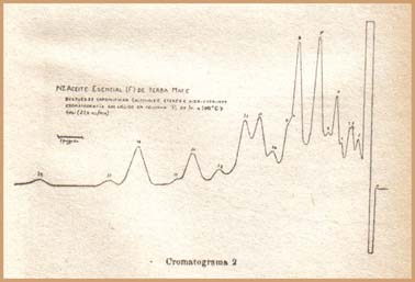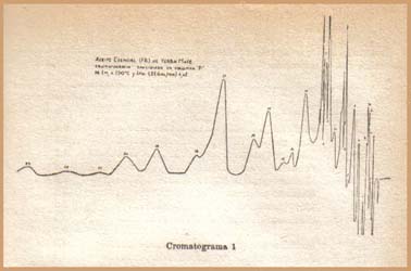 La aplicación de la cromatografía gaseosa permitió corroborar la presencia de los componentes hallados y descubrir otros: estragol y varios carbonílicos. Damos a continuación el detalle de los cromatogramas obtenidos para el aceite esencial completo y para el insaponificable del mismo arrastrado por vapor de agua.