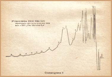 En total se puede estimar, con los datos de la cromatografía gaseosa del aceite litare de ácidos y fenoles (23 componentes como mínimo, en columna "P" a 150°C) más los registrados en cromatografía con columna de "saib" (a 175°C aparecen ocho componentes más pesados, no registrados en la columna "P"), los ácidos libres identificados y los fenólicos registrados por la cromatografía en placa, que el aceite esencial de yerba mate contiene más de sesenta componentes.