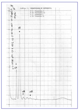 El extracto fue filtrado por una columna de florisil (Clean-up) para la eliminación de gomas, mucílagos y resinas, empleando éter de petróleo y cloroformo como solventes de elución, y finalmente el eluato concentrado a pequeño volumen por evaporación a presión reducida fue analizado por cromatografía en fase gaseosa mediante un aparato Varian modelo 3700 provisto de sistema de integración de picos y computación de datos modelo CDS 111 de la misma marca. Se empleó una columna de vidrio de 1,80 m x 3 mm al 2 %, OV-1 + 3 % OV-210 sobre Chromosorb W 80/100 detector de ionización de llama (FTD), tomando como referencia una mezcla de piretrinas de 56,4 % de pureza provista por la United State Environmental Protection Agency de los Estados Unidos de América.