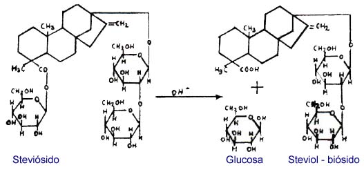 La estabilidad en medio ácido es una propiedad que facilita su empleo en bebidas gaseosas caracterizadas por su tenor ácido. En medio alcalino se elimina una molécula de glucosa y se obtiene el steviol-biósido, que posee un menor poder edulcorante que el steviósido; en la fig. N° 2 se indica el proceso mencionado.