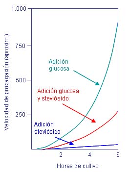 Los microorganismos, agentes responsables de las caries dentales, prácticamente no se desarrollan en un medio de cultivo al cual se adiciona steviósido (gráfico N° 2) (7).