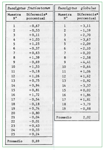 La concordancia entre estas dos técnicas de análisis surge también de la tabla V, donde se observa que las diferencias porcentuales entre los valores obtenidos en E. fruticetorum son en todos los casos inferiores a 1,75%, con un 76% de las muestras presentando diferencias menores al 1% y un valor promedio de 0,69% para las 25 esencias estudiadas. En E. globulus las diferencias son mayores pero inferiores al 4,45%, con un promedio para las 19 esencias analizadas de 2,02%