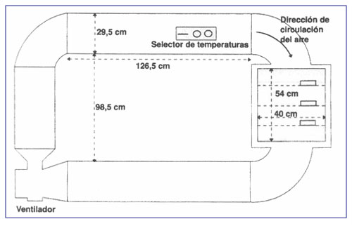 El túnel de secado ha sido construido con postes y travesanos de madera, cubiertos por plástico transparente tipo U.VT., ubicado bajo la cubierta del invernadero a lo largo de su eje principal. En su interior se han instalado dos rieles y al final del túnel se encuentran dos ventiladores eléctricos axiales montados sobre una estructura soporte móvil, que permite su desplazamiento en el momento que es necesario el paso de los carritos, Fig. 2, sector B.