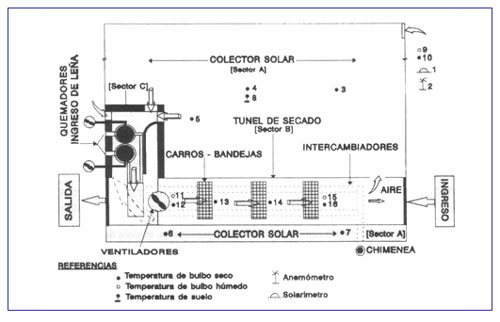 La idea, básicamente consiste, en acondicionar un sector del interior del invernadero para transformarlo en un túnel y adosarle los sistemas auxiliares de calentamientos de acuerdo con las necesidades térmicas del proceso de secado. El resto del espacio disponible se transforma en un colector térmico solar mediante la incorporación de una lámina de plástico negro extendida en el interior del mismo. El área efectiva de colección es 305 m2, Fig.2, sector A. Las cortinas laterales del invernadero han sido bajadas totalmente y enterradas a lo largo del perímetro del mismo para evitar la fuga o entrada de aire desde el exterior.