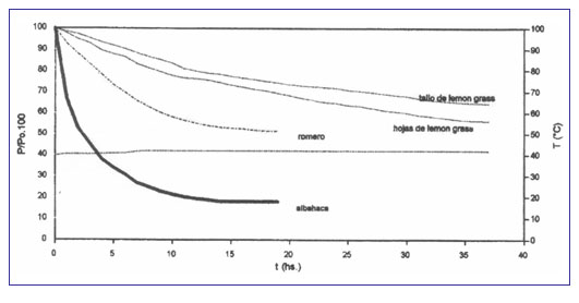 Se realizó el secado de albahaca, romero y lemon grass, que fueron colocados sobre las randejas de cámara de secado se ha descripto anteriormente. La temperatura de bulbo seco que se obtuvo fue entre 40 y 50° C. El aire se puso en movimiento mediante un ventilador de -4 HP y la velocidad del mismo se mantuvo alrededor de 1,0 m/s.