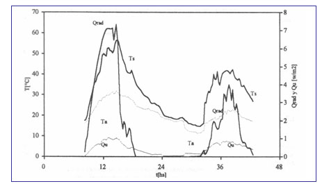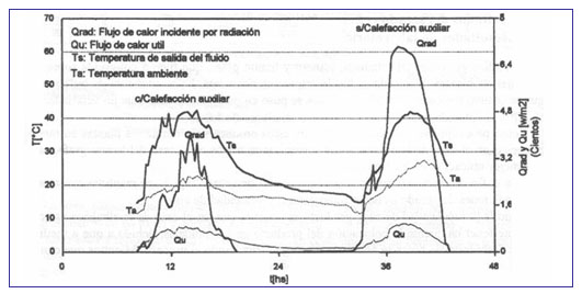 En la Fig.5, se muestran las mismas variables, pero ambos días con calefacción auxiliar a los efectos de lograr temperaturas más altas, en el orden de los 50° C. El aporte auxiliar permite durante el segundo día compensar una caída de la radiación ocurrida entre las 11 y 14 hs. Sin embargo se advierte que la temperatura de salida ha aumentado por sobre el valor establecido, esto se debe a que el piso del invernadero después del primer día ha acumulado una cantidad importante de calor. Se advierte, que el balance total es similar en ambos días y el flujo total de calor disponible es aproximadamente igual.