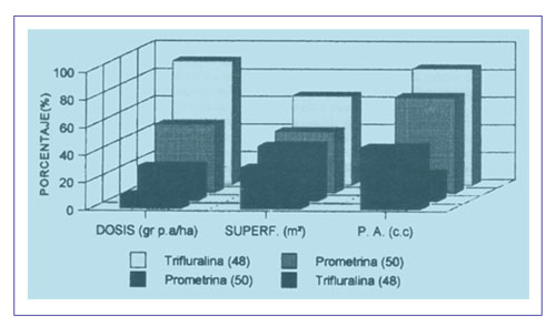 Materials and Methods: Several herbicides and different doses were assessed for the Sweet basil Catamarca INTA cultivar. Treatments: l°- Trifluralina 48 % 600 gr p.a./ha; 2°- Prometrina 50% 1000 gr p.a./ha; 3°- Prometrina 50% 520 gr p.a./ha; 4°- Trifluralina 48% 1000 gr p.a./ha.; 5°- Control. The design of the experiment was in randomized blocks with 4 replications, each consisting of four 5 m rows 0.70 m apart.