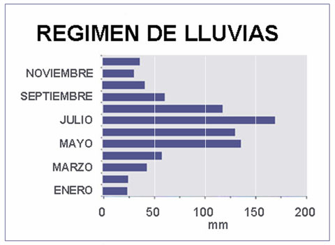 La distribución de las precipitaciones es otoño, invierno, primavera, con marcado déficit hídrico estival. El total anual fue de 863 mm. Se adjunta gráficos sobre dichos datos.