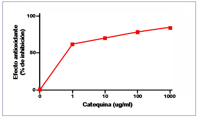 Los efectos antioxidantes fueron medidos en tres concentraciones de extracto acuoso 10, 100 y 1000 ug/ml y fueron expresados como porcentaje de inhibición de la quimioluminiscencia (Tabla 1), evaluados a la máxima emisión (Cadenas y Sies, 1982), los resultados de inhibición, matemáticamente expresados como negativos, significan un aumento de la quimioluminiscencia. Se utilizó catequina como control y standard de actividad, por tratarse de uno de los productos naturales con mayor actividad antioxidante (Fraga et al, 1987), mostrando una IC50 cercana a 1 ug/ml (Fig.l).