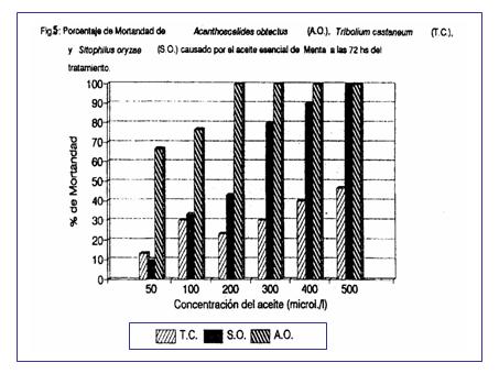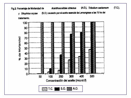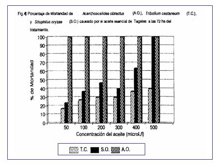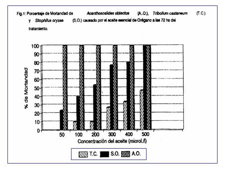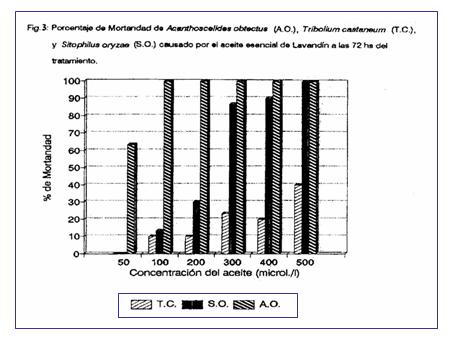 En S. oryzae la mortandad fue del 50% aplicando 200 jjl/1 de las esencias de orégano y tagetes; con 300 (jl/1 de orégano, lavandín y menta la mortandad alcanzó el 80 % y a 500 µl/l de orégano, lavandín, tagetes y menta murieron todos los insectos. A. obtectus resultó la especie mas susceptible, pues a la menor concentración (50 ul/l) de orégano, lemongrass y tagetes ya se registró el 100 % de mortandad, porcentaje que fue igualado cuando se utilizaron 100 µl/l de lavandín y 200 µl/1 de menta.