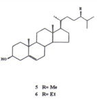 Los esteroles identificados fueron stigmasterol (4), campesterol (5) y sitosterol (6), todos ellos ampliamente difundidos en el reino vegetal. Los triterpenos aislados fueron el raro 24-metilencicloartanol (1) para el que se reportan por primera vez los datos de masa y 1H RMN, además de lupeol (2) y β-amirina (3).