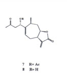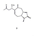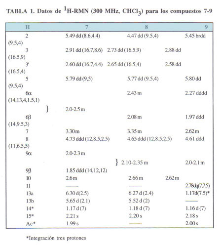 La estructura de 7 fue establecida rápidamente por los datos de 1H-RMN (Tabla 1) y comparación con los datos de la literatura. El desacetil derivado 8, llamado hidroxitomentosin9, mostró un espectro similar al de 7 con el esperado corrimiento a campos mas altos para la señal de H-2 (d 4.47 ppm) y la desaparición de la señal de acetato (Tabla 1). Del mismo modo, el espectro protónico de 9 mostró que se trataba del 11,13-dehidro derivado de xanthumin (7), debiendo destacarse el acoplamiento homoalítico de H-6α con H-2 (ca. 1 Hz) y con H-10 (ca. 1.5 Hz).