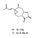 La química de X. cavanillesii está de acuerdo con la reportada para otras especies del género5-13 que típicamente producen un tipo especial de seco-ambrosanolidos denominados xanthanolidos cuyo esqueleto sesquiterpénico corresponde a los compuestos 9-11 y 13 . La lactona 8-epi-xanthatin (13)10 se adiciona a los xanthanolidos reportados previamente en esta planta6. Notablemente, X. cavanillesii produce dos sesquiterpenos degradados: el bis-norxanthanolido 126 y loliolide (14)11.