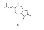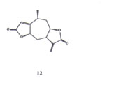 El bis-norxanthanolido 12 fue aislado en muy pequeña cantidad. Su estructura fue asignada en base al espectro de masas por ionización química que mostró un ion cuasi-molecular a m/z 235 [M+ + H]+ (int. relativa 100 %) de acuerdo con la fórmula C13H14O4 y los datos del 1H-RMN. La similitud de los valores de acoplamiento de H-7, H-8 y H-10 con los correspondientes a xanthumin (7), hidroxitomentosin (8) y 11,13-dihidroxanthumin (9) indican que la lactona 12 también esta lactonizada cis con el Me-14 en posición β. Por otra parte, H-5 se ubicó en posición α para justificar los significativos acoplamientos alílicos observados entre H-2 y H-5; H-2 y H-10; H-5 y H-10 y los acoplamientos vecinales entre H-5 y H-6α y H-5 y H-6β.