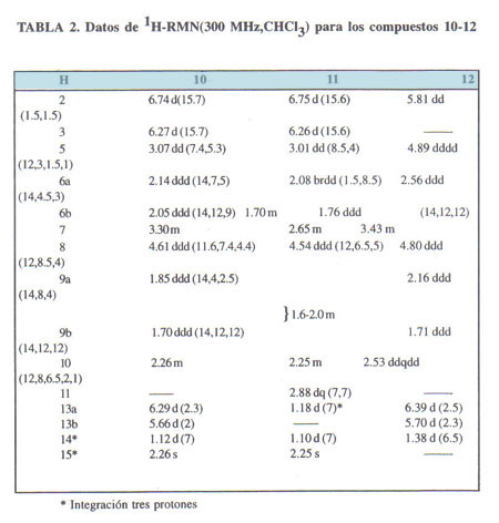 La presencia de un 4,5-epóxido en 10 fue indicada por el dd a δ 3.07 el cual estaba acoplado con dos ddd a δ 2.14 y 2.05 (Tabla 2). Experimentos de DR y COSY permitieron la asignación de todas las señales. La configuración β-epóxido en 10 fue asignada en base a la magnitud de los acoplamientos 5,6α y 5,6β y el uso de modelos moleculares. Apoyo adicional a la configuración asignada surgió de la comparación con dos epóxidos similares aislados de Xanthium spinosum13.