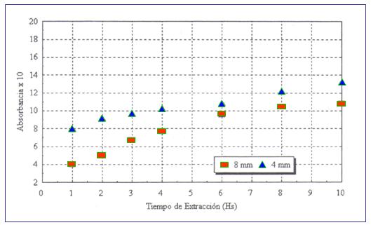 En la Figura 1 se muestran las curvas de absorbancia obtenidas para los tamaños de partículas de 8 y 4 mm. Se infiere que la transferencia de solutos desde la matriz sólida hacia la solución está controlada por la resistencia en la partícula, por lo que a menor tamaño se mejoraría la rapidez de extracción. En un ensayo posterior realizado con partículas de 2 mm se presentan problemas de aglutinación del material dificultándose el proceso. En cuanto al rendimiento, los dos ensayos arrojan un resultado del 5 % (5 grs. oleorresina / 100 grs. de ajo fresco) por lo que el tiempo de 10 horas resulta suficiente para alcanzar la concentración de equilibrio en la solución.