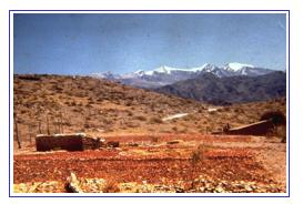En la foto se muestra una cancha de secado en Cachi Adentro, Salta. En primer plano hay pimientos parcialmente secos y atrás una tanda recién cosechada. A la izquierda un pequeño secadero pasivo construido con paredes de adobe, cubierta de polietileno LDT y bandeja de caña. |