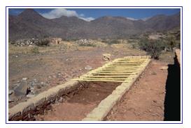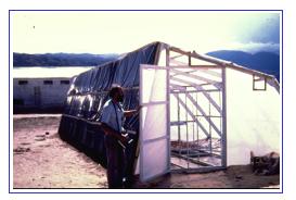 La segunda foto muestra una etapa constructiva de un equipo similar. La pared norte (a la derecha en la foto) tiene unas aberturas para el ingreso de aire, por debajo del plano de la bandeja de cañas, mientras que la pared sur tiene las aberturas por arriba para permitir la salida del aire húmedo. La radiación solar se absorbe sobre el producto dispuesto sobre la bandeja de caña, lo calienta y calienta el aire del recinto, lo cual genera una corriente ascendente. |