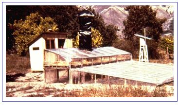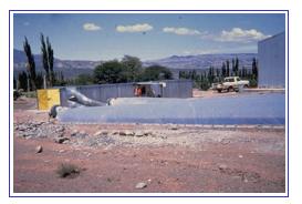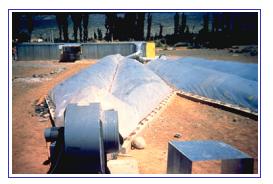 Ingreso de aire a temperatura ambiente. Los ventiladores, además de impulsar el aire, mantienen infladas las cubiertas de los colectores solares. Los colectores se construyeron directamente sobre el suelo, con fondo de telgopor, sobre el que se colocaron piedras pintadas de negro. La cubierta de plástico se sujeta en los costados a una estructura de hormigón. |