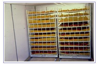 El sistema que muestra la foto se construyó en Santa María, Catamarca. La estructura es de madera, con la pared sur (izquierda) de polietileno negro y telgopor, para disminuir las pérdidas térmicas y las restantes y el techo, de polietileno LDT. En el interior se disponen dos cámaras iguales, que ocupan la mitad del recinto cada una y los ventiladores impulsan el aire entre una que opera como colector y la otra que lo hace como cámara de secado. La cámara que trabaja como colector puede cargarse con pimiento parcialmente seco, lo que aumenta la eficiencia del equipo. El sentido de circulación del aire puede invertirse, alternando el modo uso de las cámaras. |