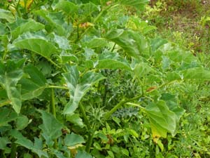 Agrega que la aplicación tópica de macerado de hojas o cataplasma de hojas y semillas (a veces mezcladas con semillas de lino) se usa como calmante para el reumatismo, artritis, neurálgias, lumbago, y tambien que un bálsamo se prepara hirviendo hojas al 10% en aceite, que sirve para fricciones en los mismos casos y para aplicar sobre heridas y quemaduras.