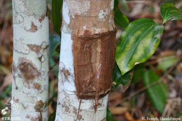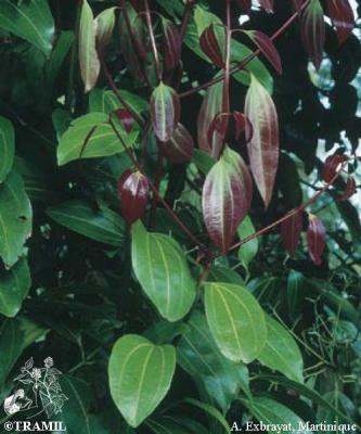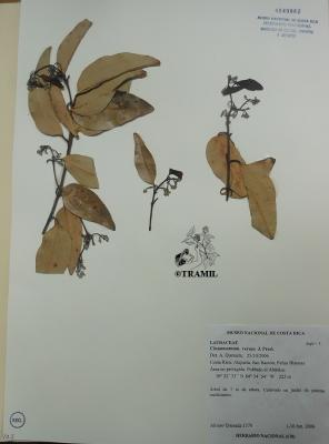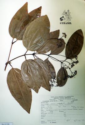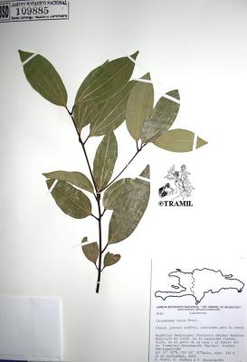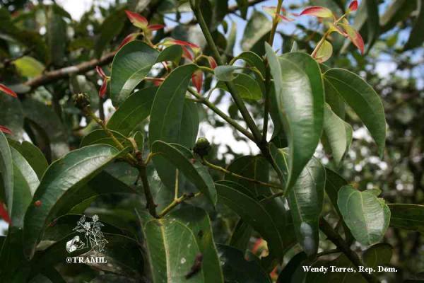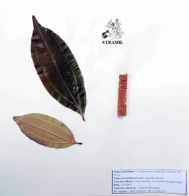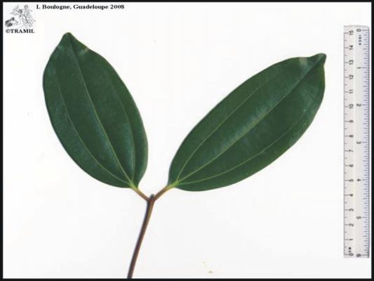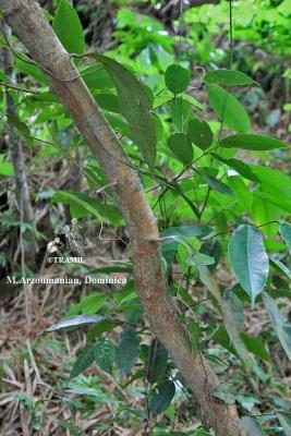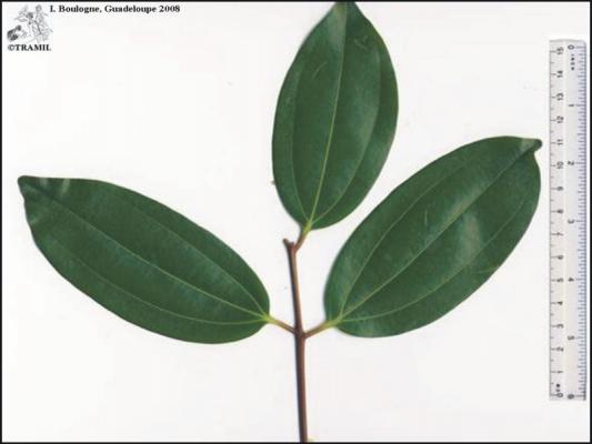 8-15 m tree, very aromatic bark. Opposite and subopposite leaves, up to 15 cm, markedly trinerved from the base to near the apex, shiny in the beam, hairless, ovate to elliptic-lanceolate, rounded at the base. White-yellowish flowers in loose panicles. Fruits of 1.7 cm with a point.