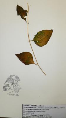 Screening fitoquimico de de hoja de Anredera leptostachys (infusión, deccoción y extracto etanólico (maceración). Trabajo TRAMIL. Grupo de Investigación en Química de Medicamentos, Universidad de Cartagena, Colombia.